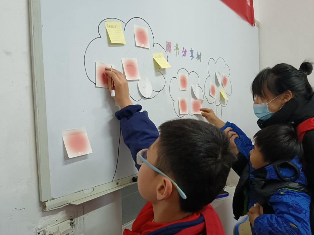 活动开始,青年志愿者们给小朋友们分发便签,把喜欢的书籍写在便签上,由志愿者们带领小朋友们对图书分享树进行丰富。