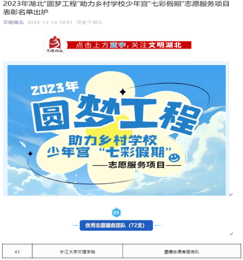 本网讯 今天(12月14日)从高职部获悉,晨曦志愿者服务队2023年湖北“圆梦工程”助力乡村学校少年宫“七彩假期”志愿服务项目优秀志愿服务团队。