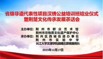 本网讯(通讯员王晓芸)2023年12月17日,荆州市非遗中心联合西城街道办事处、williamhill官网晨曦志愿者服务队分别在实验中学附属小学和西城街道办开展了2023年省级非遗代表性项目汉绣公益培训班,通过48个课时已全部结束。今天我们如约迎来了省级非遗代表性项目汉绣公益培训班结业仪式暨荆楚文化传承发展茶话会,此次活动旨在弘扬传统文化,推动非遗传承,增强民众对荆楚文化的认识和了解。