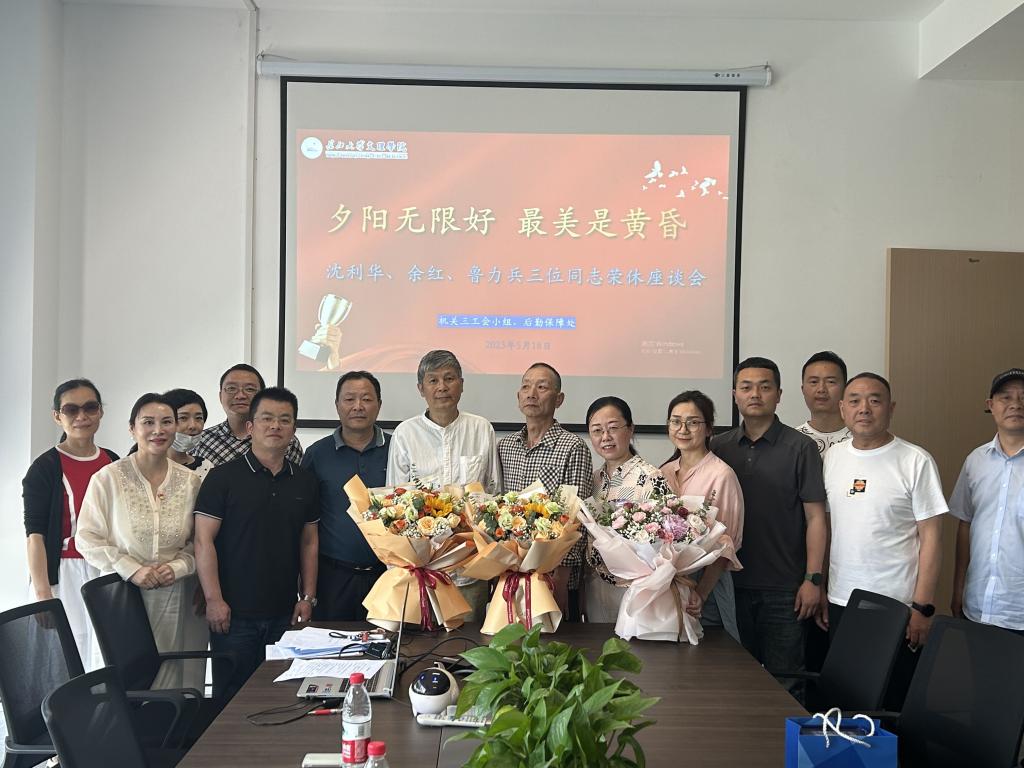 5月18日下午,机关三工会小组、后勤保障处为即将退休的余红、沈利华、鲁力兵三位职工举办荣休座谈会。院长助理郭明虎、工会主席刘磊、机关三工会小组代表及后勤保障处全体教职工参加,座谈会由机关三支部书记曲莉主持。