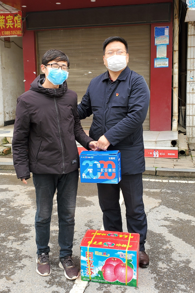 李波涛(右)代表文理学院慰问滞留荆州城区学生。(何培元摄)