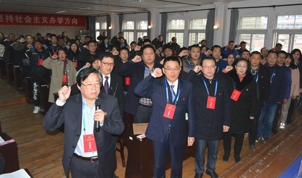 全体代表起立,举起右手,由副院长尹家经领誓,重温入党誓词。