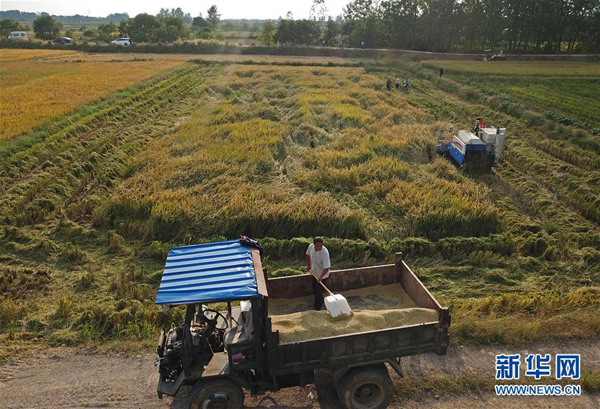农民在安徽凤阳县小岗村一处稻田收割(9月27日无人机拍摄)。新华社记者才扬摄