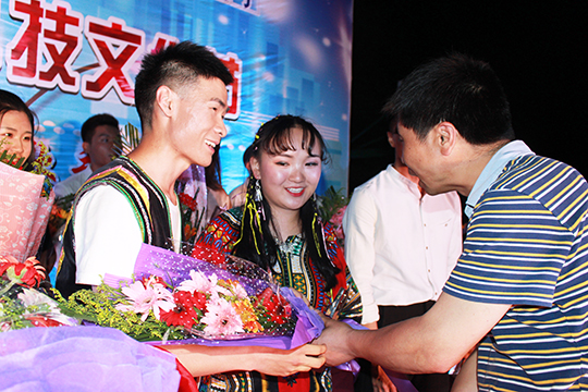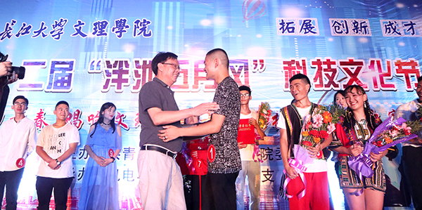 梅平、李琴、郭睦庚和相关系部负责人为获奖选手颁奖。在为冠军毛兴民同学颁奖时,梅院长为他的歌喉和出色表现点赞,鼓励他发扬比赛精神,在今后的学习中取得更好的成绩和更大的进步。