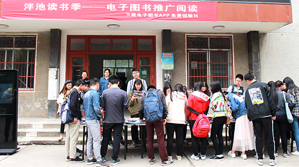 本网讯(见习记者 吴庆慧)5月7日中午,在西校区4教楼前,我院图书馆“泮池读书季——电子图书推广阅读”举行。图书馆负责人和数百名师生参加活动。