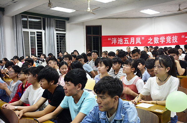 本网讯(见习记者 吴庆慧 夏承茜)5月10日晚,在西校区4教300教室,第十二届“泮池五月风”科技文化节之数学竞技“大武台”闭幕式暨颁奖典礼举行。300余名师生现场观摩比赛。医药与护理系党支部副书记祝峰,数学教研室王春鸽、李莹莹、胡传峰老师担任评委。