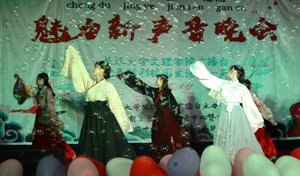 本网讯(记者 吴秀丽)5月20日晚,由我院广播台主办的“魅力新声音”文艺晚会在城中校区工会大厅举行,广播台全体成员与来自各系部的百余名师生共同观看节目。