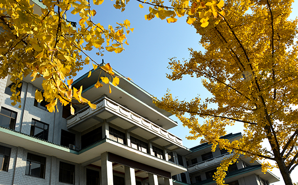 盛装的银杏,簇拥着阳光下美丽的教学楼。