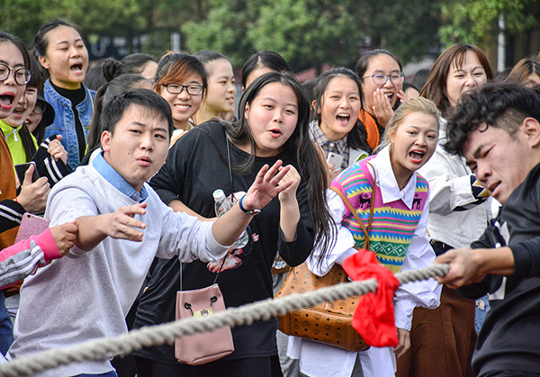 正在为女子3000米运动员们加油的设计系同学李小江说:“虽然自己没有参加这个项目,但可以从精神上鼓励运动员,让他们有坚持下去的动力和信心。同时,拉拉队把大家的心聚在一起,增强了班级凝聚力、荣誉感,让比赛更出色。”