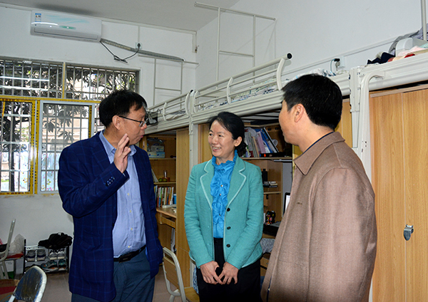 孙玉秋副市长(中)对焕然一新的宿舍环境表示赞赏
