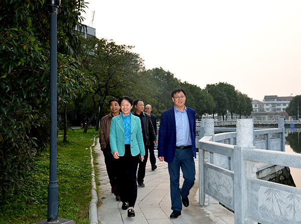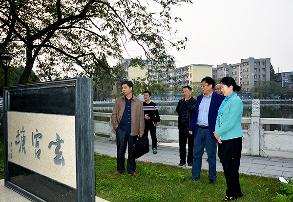 孙玉秋副市长(右一)在梅平(右二)等的陪同下观赏玄宫塘碑