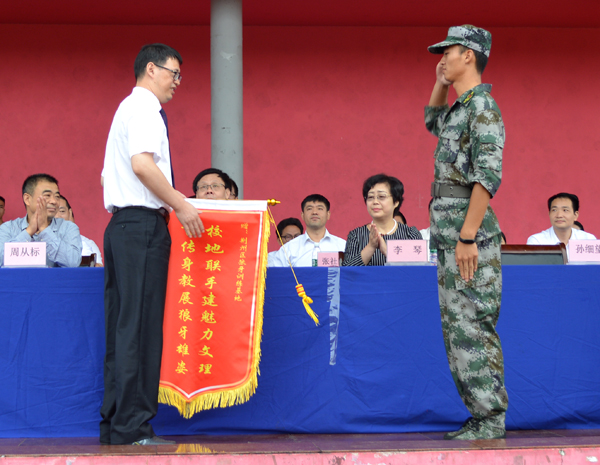 孙细望代表学院向荆州军分区教导大队赠送锦旗,全体起立鼓掌欢送教官。