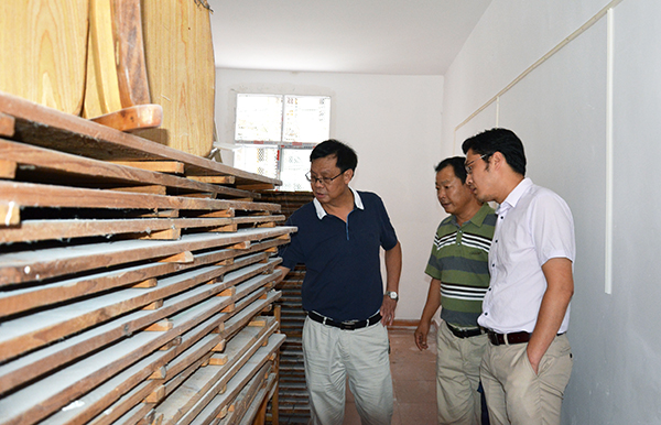 梅平(左一)、郭明虎(中)了解工程进展情况