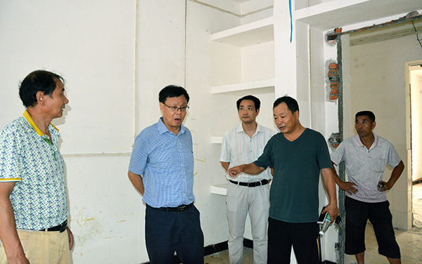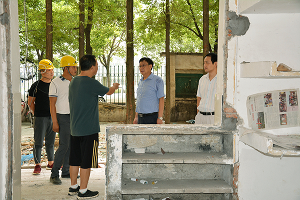 梅平(右二)了解城中校区2号学生宿舍楼维修改造工程施工进展情况