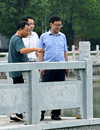 梅平(右一)、郭明虎(左一)等兴致盎然的观赏玄宫塘的碧莲田田