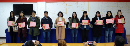 出席颁奖仪式的领导为获奖学生颁发荣誉证书、奖金