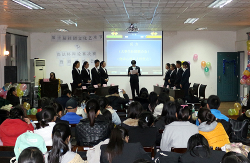 本网讯(学生记者 王若兰 周思奇 见习记者 王群尧 王莉)12月9日,我院第十届社团文化艺术节闭幕式暨颁奖晚会在我院工会大厅举行。整场晚会共有12个节目,包括声乐、舞蹈、小品和朗诵等节目类型。并为获得“优秀社团”、“社团之星”、“优秀组织奖”的集体和个人颁奖。
