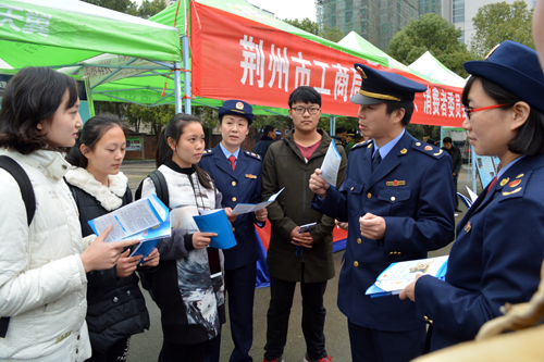 当天,荆州市工商局城南分局局长郑小杰、副局长郑治权,综合科科长李俊玲,荆州市电子商业协会秘书长姚怀玉,我院学生工作处处长刘磊、经济与贸易系相关负责人参加活动开幕式。刘磊致词,希望同学们认真学习消费维权知识,合法保护自身权益。姚怀玉宣读“网络诚信 消费无忧”倡议书。