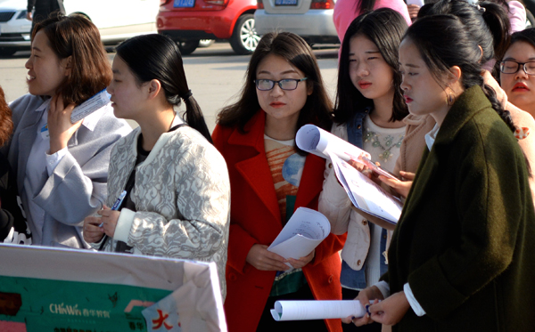 在招聘现场的每个展台前,都立起大幅招聘信息展板,列明企业简介、招聘岗位、招工人数等信息。前来应聘的毕业生认真阅读招聘信息,遇到感兴趣的,便上前询问岗位要求、待遇等情况。人力资源管理专业毕业生薛会芳,想找一份人事管理工作。在南京一家公司设的招聘展台前,她咨询了工资待遇、岗位设置等情况后,在求职人员花名册上登记了信息。