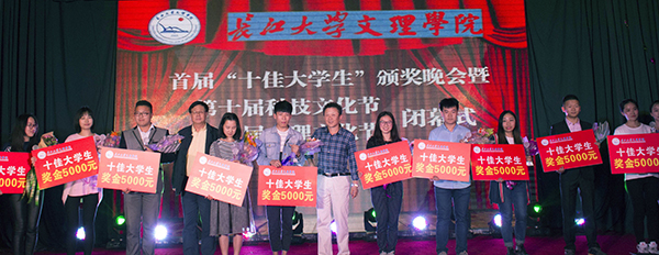 院长梅平、王昌军共同为十佳大学生颁发奖牌、荣誉证书和每人5000元奖金;党委书记王金琼、副院长李琴、党委副书记孙细望,分别为第五届心理文化节、第十届“泮池五月风”科技文化节获奖代表颁奖。