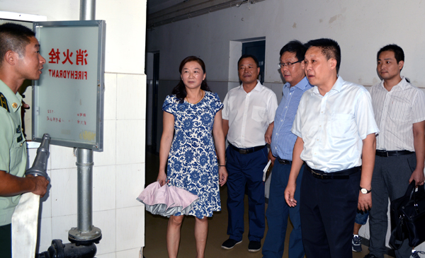 会后,黄念平一行在梅平的引导下,深入校园安全保卫监控室、学生寝室、新生消防演练场地进行了实地考察走访。在女生7舍楼管处,黄念平仔细询问宿舍管理制度,查看了寝室值班登记表,在男生寝室5舍,黄念平一行走进学生寝室,认真查看学生门窗、床铺、洗漱间等设施。在新生消防演练场地,黄念平提醒新生注意人身和财产安全,注意防火防盗,不参与网络借贷。
