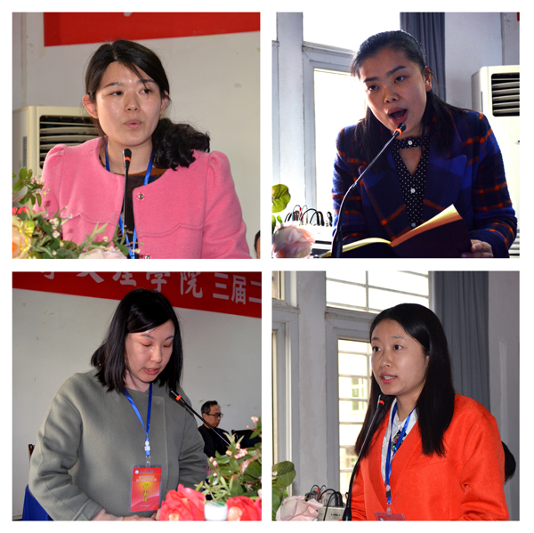 下午4点,带着代表团的讨论意见,许梦怡、孙婉婷、罗婷、李思薇分别代表4个代表团登台发言,全面介绍了各代表团的讨论情况。大家一致认为,院长梅平关于《坚持依法治院 推进转型发展 努力开创学院事业发展新局面》的工作报告,对过去一年以来学院各项工作的总结客观全面,对今后工作的部署思路清晰,目标明确,重点突出,措施得力,符合当前形势和学院实际,鼓舞人心,催人奋进。