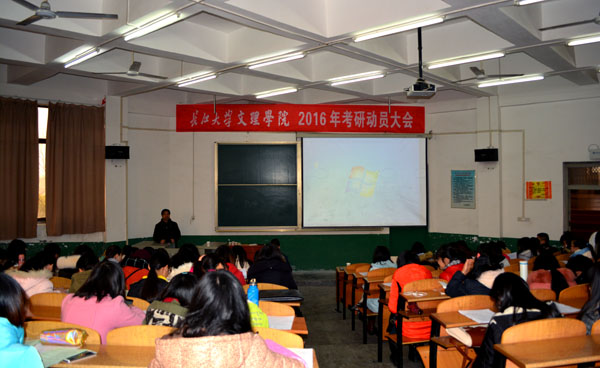 本网讯(记者 吴秀丽)为进一步鼓励和提高2016届考研学生的积极性和信心,12月24日,我院分别于西校区、城中校区召开2016届学生考研动员会。副院长郭睦庚出席并作动员讲话,党委副书记孙细望,学工处处长解礼元、学工处李辉老师、外国语系胡广耀老师,255名2016届备考学生参加了动员会。会议由孙细望主持。