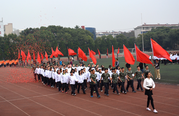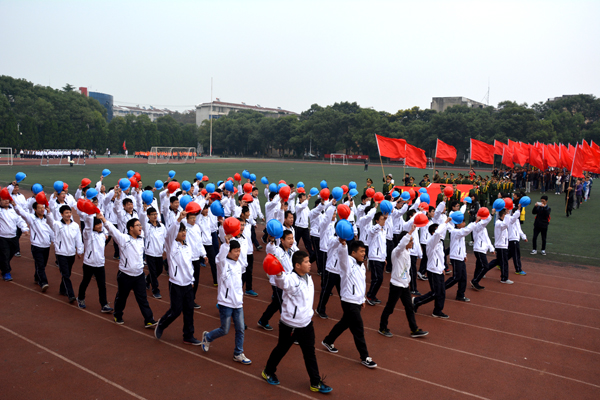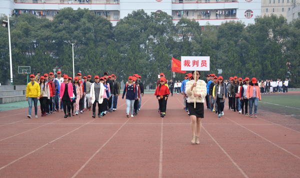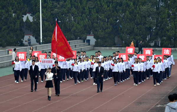 国旗队旗手擎着鲜艳的五星红旗,身着整齐的制服,英姿飒爽,迈着矫健的步伐通过主席台。师生共同组成的裁判队步伐整齐一致,精神饱满,怀着“公平公正”的信念大步向前。经济与贸易系的同学们高举“精贸易、通管理、善营销、懂商法”的标语,手拿红黄鲜花,踏着有力的步伐勇往直前。黄色的星星组成“人文”二字,鲜红的旗帜在手中随风飘扬,同学们面带微笑,彰显人文学子的青春活力。外国语系的同学们手拿红黄两色灯笼, 一起一落,别样风景。 机电与信息工程系的同学们头戴红蓝相间的头盔,显得格外醒目,朝气蓬勃。身着雪白色护士服和医生制服的是来自医药与护理系的方阵,他们精神饱满,斗志昂扬。“风华管理,无与伦比,齐心协力,共创佳绩。”工商管理系的健儿们喊着嘹亮的口号,向空中抛出绚丽的礼花。穿着鲜亮的橙色衣服,高举“设计之家欢迎你”标语,建筑与设计系方阵独具一格,个性十足。