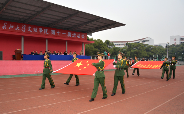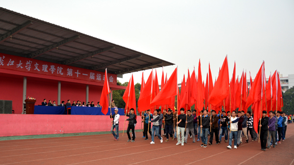 本网讯(学生记者 秦娟 见习记者 熊姿 苏小雨)10月31日上午,在我院第十一届运动会开幕式上,主席台前,国旗队、院旗队、红旗队、裁判员队以及7个系部代表队伴随着激昂澎湃的进行曲依次亮相。