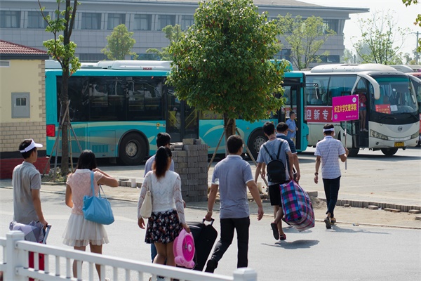 志愿者引导新生和新生家长上迎新大巴