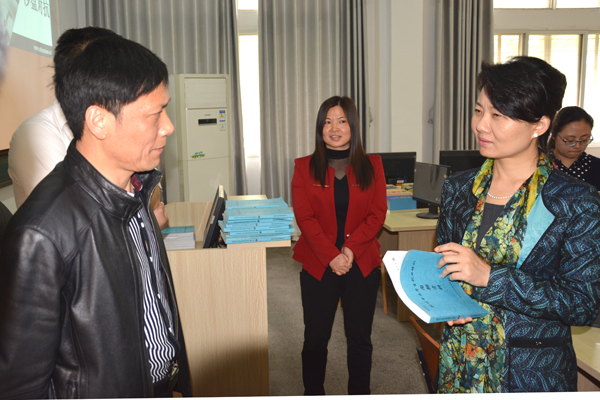 张菊老师(右二)向吕晓华(左四)介绍大学生创业培训四级课程体系
