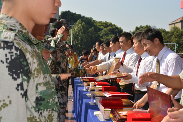 高迎斌代表学院向荆州军分区教导大队赠送匾额,全体起立鼓掌欢送教官。