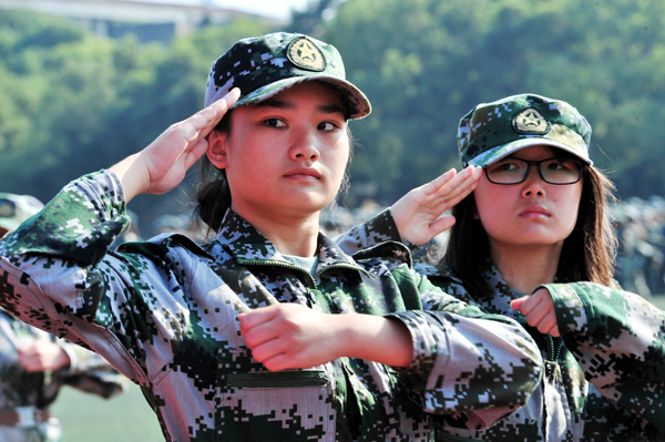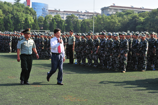 院长王金琼(右)检阅新生军训方阵