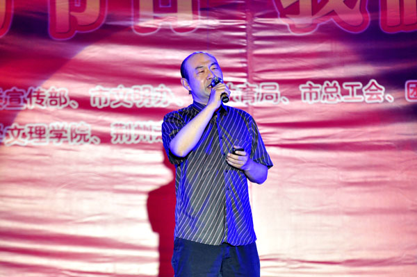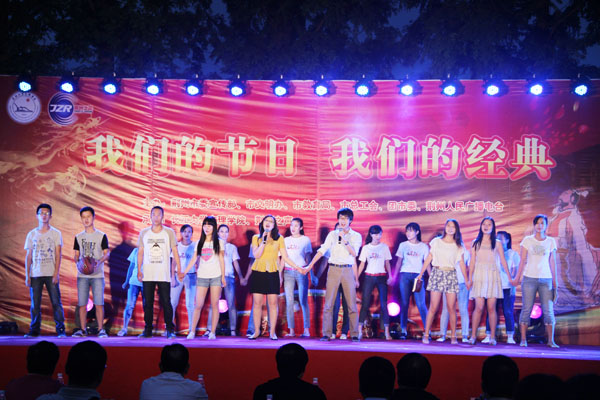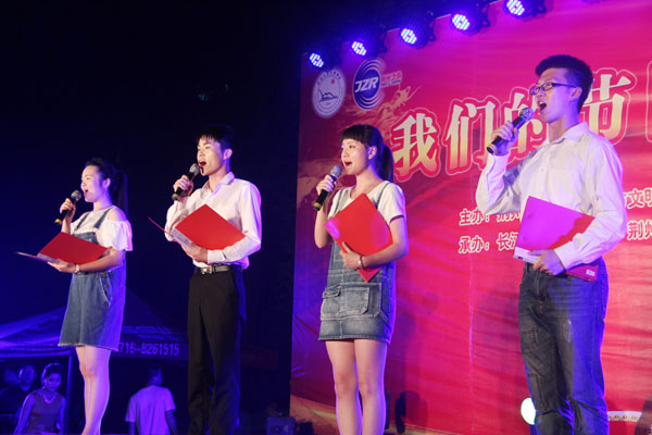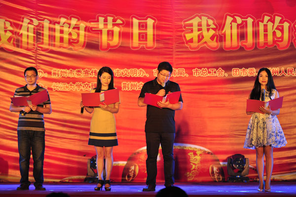 我院学子刘天佑、鲜文丽、胡六顺、王诗尧、成伟颐、曾园园等先后与现场主持人们一起表演了诗歌朗诵《城南旧事》、《离骚》、《午日沙市看龙舟》、《中国 不跪的人》,以及歌舞《红旗飘飘》、《同桌的你》等节目。