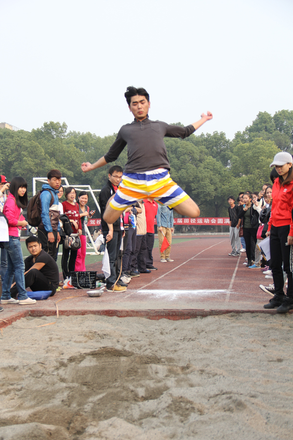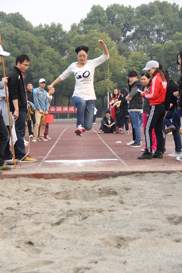 跳远赛场,王成胜老师也跳出佳绩,奋力一跃,成绩名列第五名。此前,铅球赛场,外国语系几乎全体出阵,杨宗波老师一举夺得教工40岁以上男子铅球冠军。