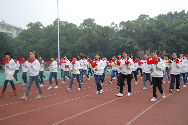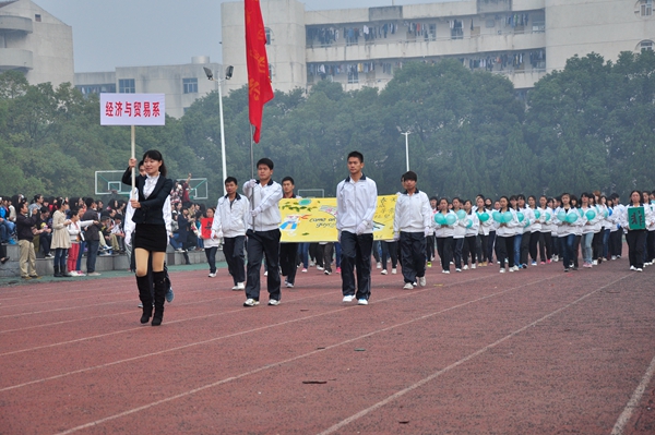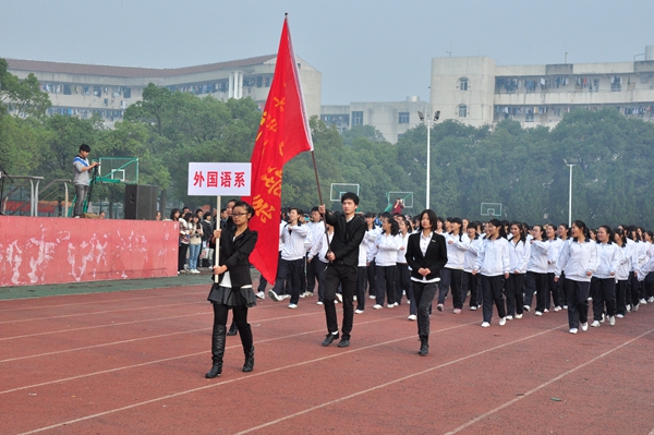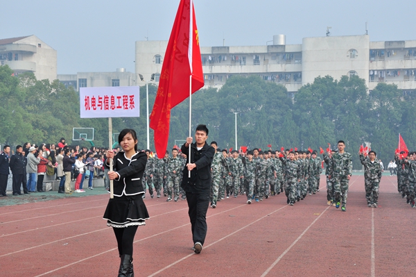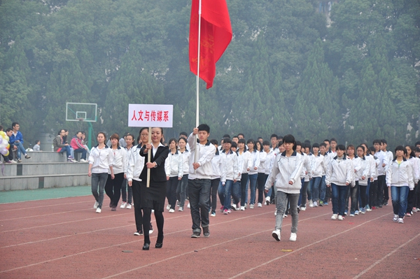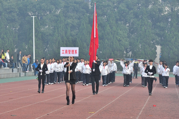 鲜花队方阵的50名女同学身着白色运动服,高举五彩缤纷的花束,面带微笑走过主席台前,同学们以充满活力的姿态和自信的口号,展示出团结拼搏、昂扬向上的良好风貌;机电与信息工程系代表队统一身着墨绿色迷彩服,高举“科技创新”的宣传牌和迎风飘扬的红旗,激情满怀地喊着“机电机电,激情无限!机电机电,勇往直前!”的口号,大步走过主席台;工商管理系代表队高举“五环”标志和“运动精彩 文理骄傲”的横幅阔步向前,展示出锐不可当,舍我其谁的霸气……
