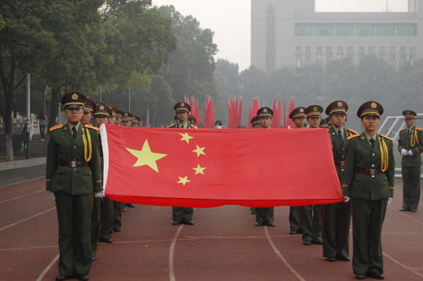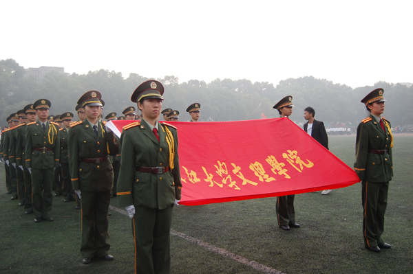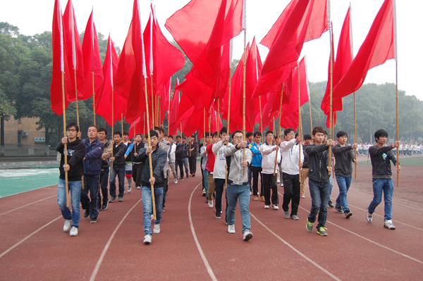 第九届校运会开幕式上,主席台前,国旗方阵、院旗方阵、国旗连方阵、红旗方阵、鲜花方阵、裁判员方阵、教职工方阵和7个系部代表队共14个方阵的精彩亮相,引来了观众们阵阵掌声与欢呼。