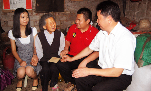我院党委副书记汪邦柱和“10.24”英雄学子昌子琪(左一)、李立科(右二)慰问贫困老人
