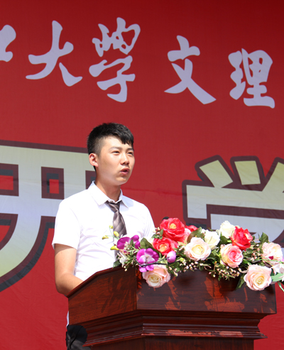 经济与贸易系国贸5132班林威同学作为新生代表发言。他在入学感言中,代表全体新生庄严承诺,将恪守校训,严格律己,勤勉求学,拼搏奋进,在翰墨飘香的大学校园编制灿烂的文理梦,努力成为求实创新、勇于开拓和博学多才的新文理人。人文与传媒系广电5101班杨青同学作为在校生发言。她欢迎2013级新同学加入文理学院的大家庭,鼓励同学们在母校的优雅环境中努力奋斗,刻苦学习,珍惜宝贵的大学时光,挥洒青春和汗水打造精彩的人生。