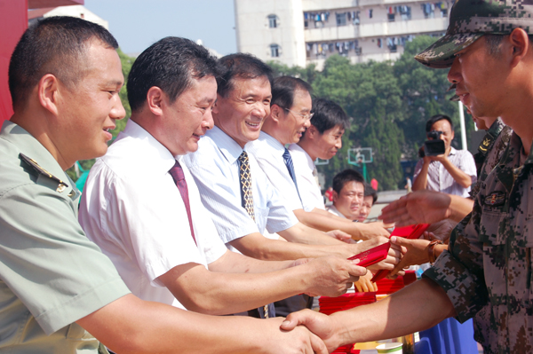 学院党委书记袁先海代表学院向荆州军分区教导大队赠送匾额,全体起立鼓掌欢送教官。