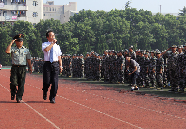 学院院长沈光明教授(右)在陈继梁副参谋长的陪同下检阅新生军训方阵