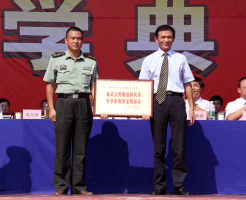 学院党委书记袁先海(右)向荆州军分区教导大队赠送匾额