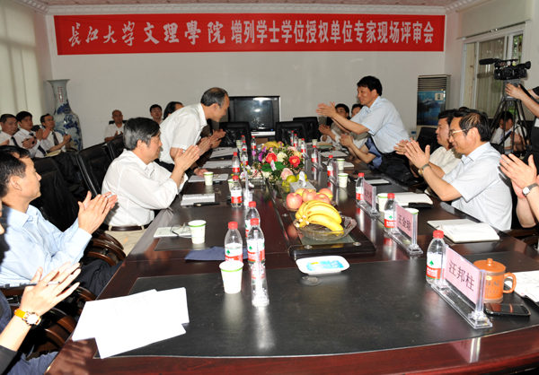 省教育厅科技处副处长丁雪峰主持会议,专家组组长康灿华教授,专家组成员刘九洲、王平祥、刘京焕、徐伟民、肖静,长江大学党委书记张忠家、校长张昌民、副校长刘在洲,文理学院领导沈光明、袁先海、王金琼、郭睦庚、汪邦柱,各学部主任及职能部门负责人出席会议。