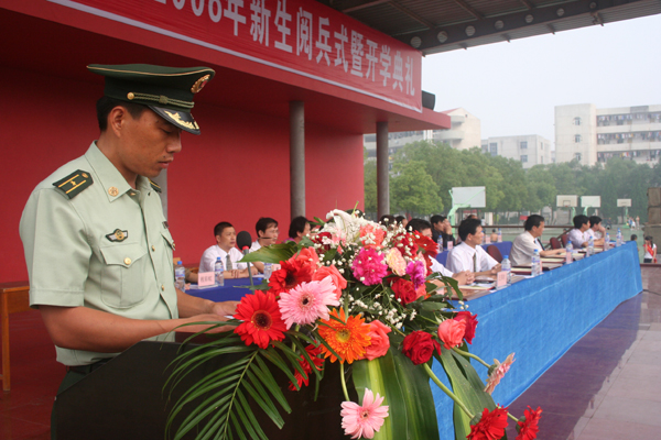 (记者:周芳)9月22日,秋高气爽,红旗飘扬,学院2008年新生军训阅兵式暨开学典礼在西校区田径运动场隆重举行。长江大学副校长刘在洲、武警荆州支队石玉海少校、学院领导沈光明、袁先海、郭睦庚、汪邦柱以及学院各职能部门、各学部的负责人在主席台就座。学院全体教职员工、新生、教官以及部分老生代表2000余人参加了阅兵式暨开学典礼。学院常务副院长王金琼同志主持了阅兵式暨开学典礼。