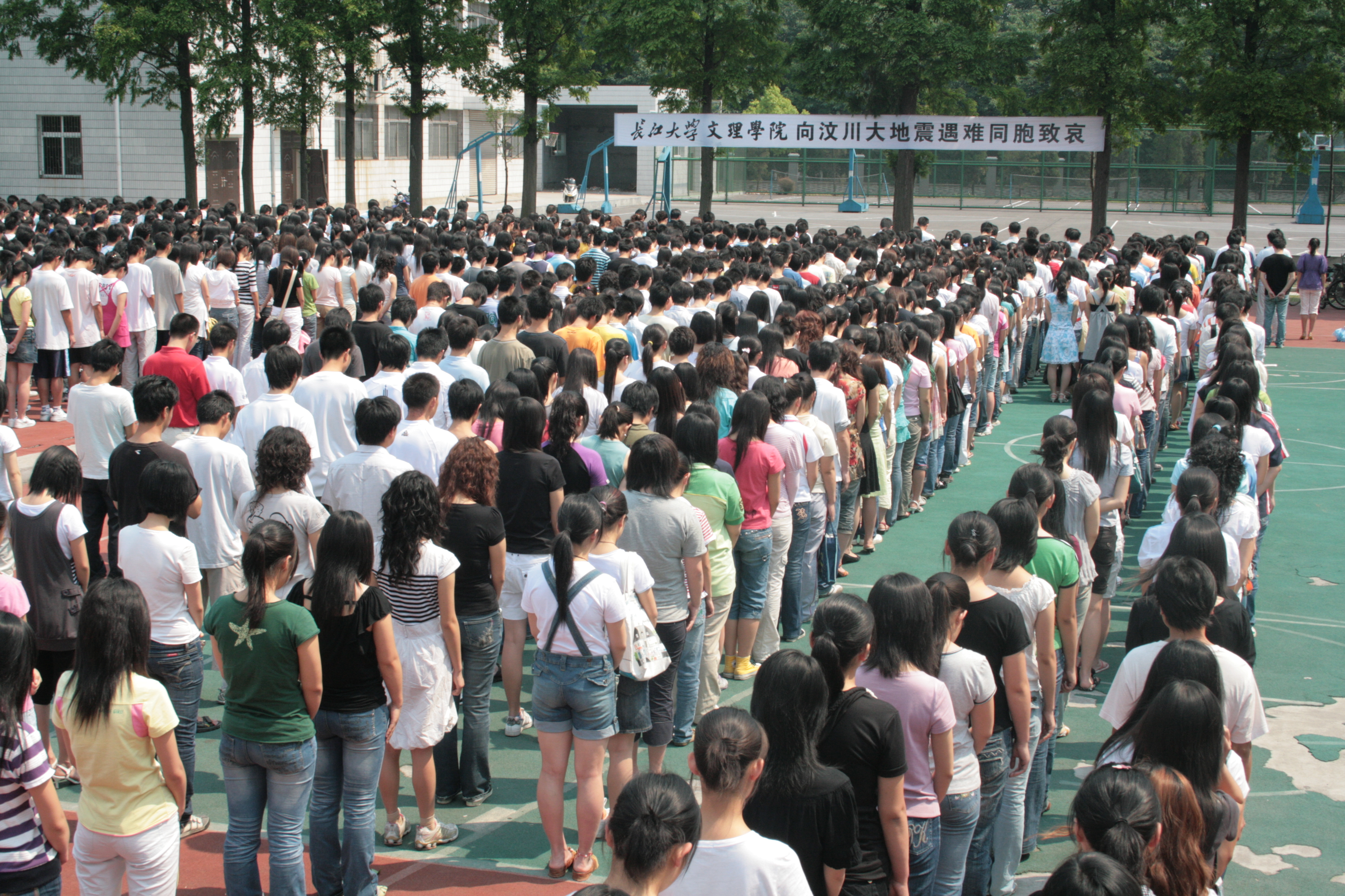 5月19日14时,学院塑胶球场就聚集了近2000余师生,在白底黑字的“williamhill官网向汶川大地震遇难同胞致哀”横幅前,学院全体院领导、教职工与学生站在一起,现场所有人都屏住呼吸、神情凝重,偌大的一个球场上悄然无声。14时28分,就在7天前这个让亿万中国人痛心的时刻,伴随着防空警报的响起,全体在场的文理师生低头为在四川汶川大地震罹难同胞默哀,所有上课学生和教师也在教室起立默哀。