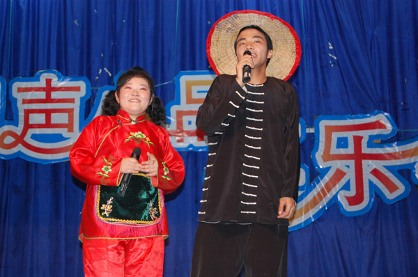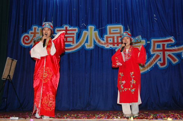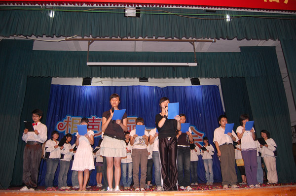诗言志、歌咏言,在舞台上,表演的同学用歌声与观众对话:黄梅戏《女驸马》、《天女散花》,花鼓戏《刘海砍樵》,江苏民歌《采红菱》……一首首戏曲将传统与现代、古典与时尚完美结合。相声小品《排戏》、《招聘》、《五官争功》等幽默诙谐,表演者深厚的功底使得掌声如潮。而喜乐之余我院师生仍心系四川地震,大型配乐诗朗诵《情系汶川》荡气回肠、催人泪下。