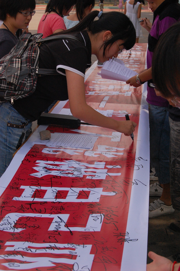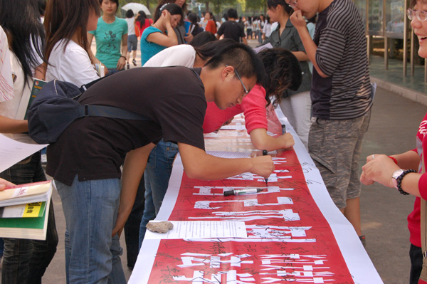 本次活动的名称是“冰冻、捍动、震动、感动、行动”。活动于下午一点钟开始,陆陆续续吸引了各个学部的老师和同学前来参与,并在宣传横幅上签名。表达了自己的爱国之情。这次活动还引起了学院领导的重视和支持,院长沈光明、党委书记董武、副院长王金琼、副书记汪邦柱和学工部主任彭中等领导也加入了签名队伍中来,并对本次活动给予了充分肯定。直到本次活动截止时,大约共有六百多师生参加了本次活动。