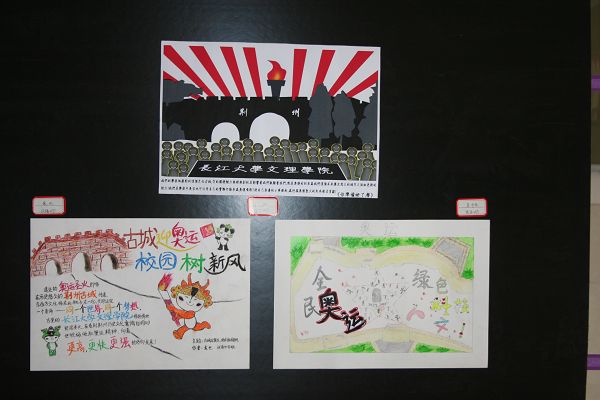 展厅共展出四十多幅优秀作品,以奥运、环保、地震为主题,贴近生活、贴近时代。“古城迎奥运、校园树新风”,此次展出的作品中以奥运题材居多,五环、福娃、“鸟巢”等作品完美的诠释了2008年奥运“人文、科技、和谐”的理念。“生命在于运动”,奥运火炬即将登陆荆州,奥林匹克神圣的火焰将在这片古老的土地上蔓延。“同一个世界、同一个梦想”,届时,象征和平的 “祥云”火炬将经过学院大门。愿这些广告设计作品提醒每一位同学――“迎奥运、讲文明、树新风、创和谐”。