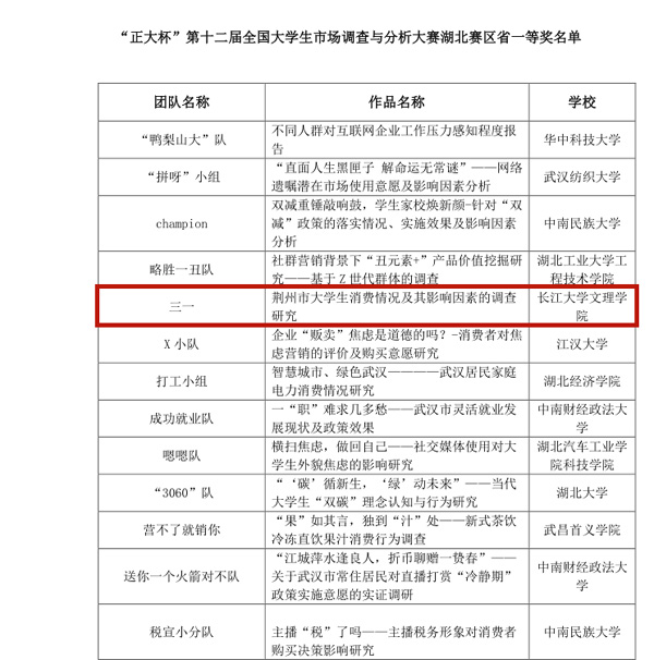 本网讯 近日,第十二届“正大杯”全国大学生市场调查与分析大赛(本科组)湖北省选拔赛在湖北大学落幕,我院管理系选派的两支代表队分别获得一、二等奖。