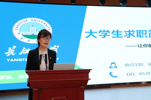 长江大学电信学院团委书记、系统分析师康玮副教授以《让你的简历Hold住HR》为题,以面试技巧为切入点,从求职简历的作用、类型、制作思路、组成要素、撰写技巧等10个方面,用真实案例对大学生求职过程中的各个环节做了深入的剖析与详尽的指导。